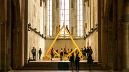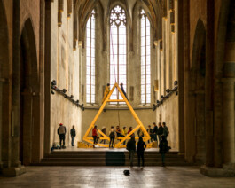 The instrument “A” is a kinetic and usable sculpture. It is derived from the functions of a roof truss, a metronome, and a ladder. It is an instrument for the body and mind that requires at least three people to be played. One person sits at the base of the pendulum while the other two stand or climb on the edges. Together, they set the tempo. The interaction creates moments of tension between balance and possible tipping moments of the structure.