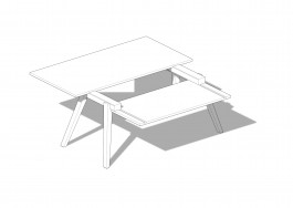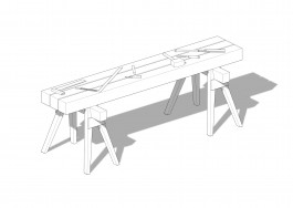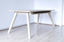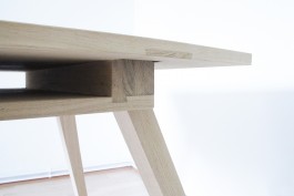 This table design started during my apprenticeship as a carpentry in 2006 and resulted from multiple variations. It uses the role and the design of carpenter trestles as a point of departure. Precise and stable trestles are quite a thing for every craftsman and people like to talk about it a lot. They are very important for marking, carving and cutting timber. The main characteristics are the inclines legs and their fabrication is quite specific and challenging. In much the same manner, I wanted to design a table that supports me as a designer while thinking, designing and drafting projects. But also uses the same joining intelligent found in the carpenters trestle and in general wood working. This table is crafted from solid oak wood and has two interlocking dovetail joints to connect the top and bottom plate. The lower compartment is for drawings and sketches.