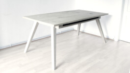 This table design started during my apprenticeship as a carpentry in 2006 and resulted from multiple variations. It uses the role and the design of carpenter trestles as a point of departure. Precise and stable trestles are quite a thing for every craftsman and people like to talk about it a lot. They are very important for marking, carving and cutting timber. The main characteristics are the inclines legs and their fabrication is quite specific and challenging. In much the same manner, I wanted to design a table that supports me as a designer while thinking, designing and drafting projects. But also uses the same joining intelligent found in the carpenters trestle and in general wood working. This table is crafted from solid oak wood and has two interlocking dovetail joints to connect the top and bottom plate. The lower compartment is for drawings and sketches.