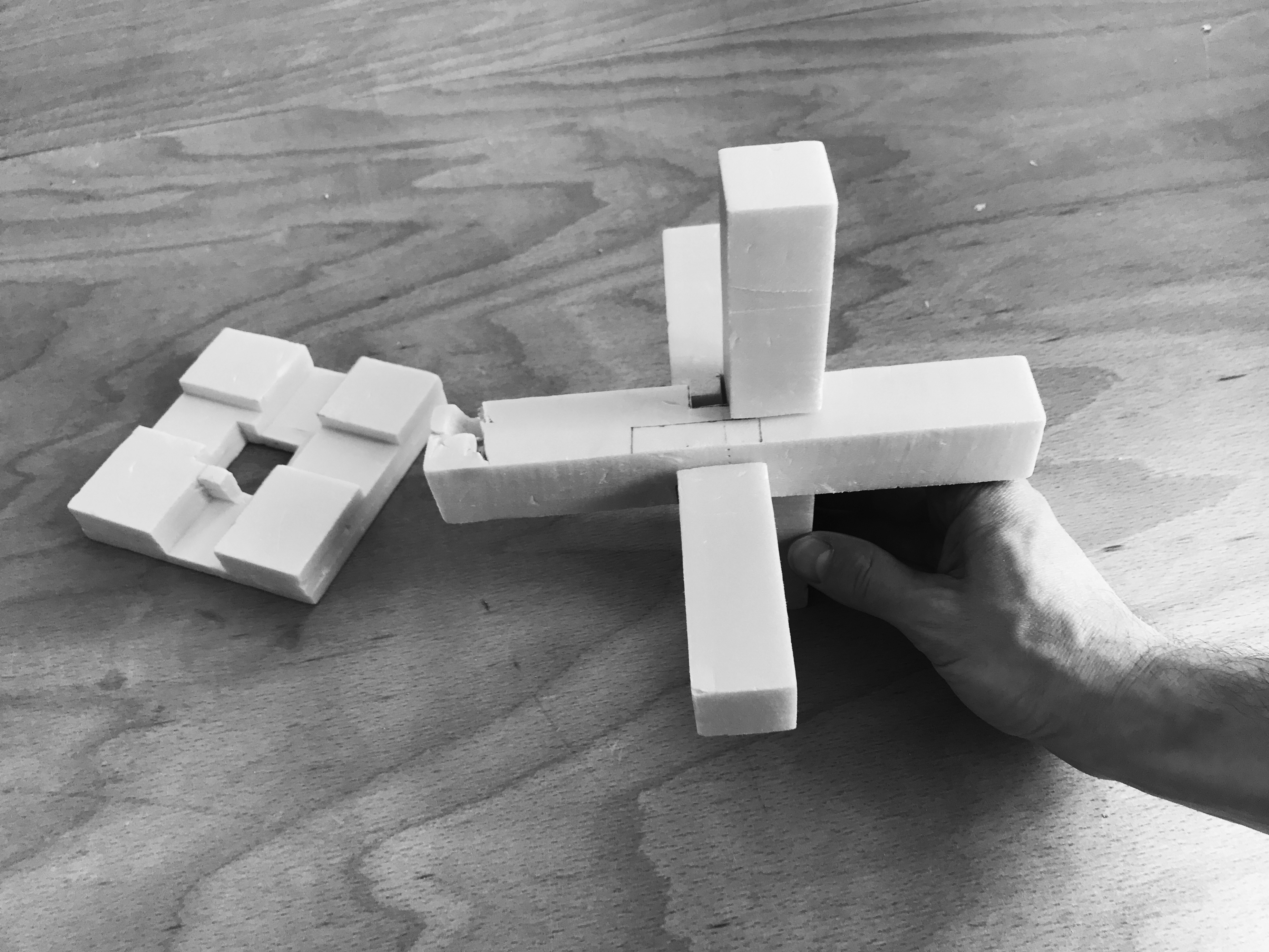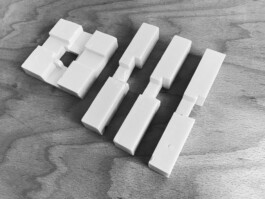 Xyz is a modular pop-up furniture designed with precise interlocking wooden joints. It is dismountable and does not require any additional fasteners. Similar to Japanese wooden houses, this system does not use diagonals for bracing, but rather relies on precise interlocking joints and plywood surfaces for stability. The modular furniture is based on a cubic tatami module ratio (45.5 x 45.5) and is made of solid birch wood beams with pine plywood surfaces. Xyz consists of three different milled beam types. They vary in length depending on the module. Each joint is locked in place by a wedge or precise plywood surfaces with continuous slots. The inserted surfaces appear in various shapes and sizes, creating horizontal surfaces for displaying products and aligning and stabilizing the overall composition.